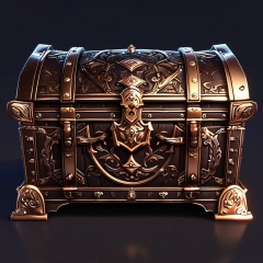 3D game asset of a medieval treasure chest, adorned with intricate carvings and metallic accents. Rich, dark wood tones with glowing gold highlights. Background with soft shadows to emphasize depth. Details include high-resolution textures, detailed lock mechanisms, and a sense of ancient craftsmanship.