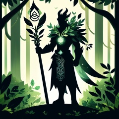 game character design for a mystical forest guardian, with organic armor made of leaves and vines. Calm, protective pose with a staff in hand. Background with a lush forest, dappled sunlight filtering through the trees. Details include natural textures, glowing runes, and a harmonious connection with nature.