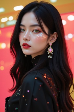 mother of pearl,Body shot,glossy,tight,Ethereal Reflections: a beautiful Girls,god light,neon,celluloid,oil skin,lustrous skin,dreamy glow,mirrored surfaces and pastel shades,1girl,solo,jewelry,black hair,long hair,green eyes,earrings,freckles,red lips,black dress,realistic,(best quality),(8k, best quality, masterpiece),ultra-detailed,(high detailed skin),glossy skin,contrapposto,female focus,model,(hot:0.7),sexy,fine fabric emphasis,wall paper,crowds,fashion,Lipstick,depth of field,street,in public,(Magazine cover-style illustration of a fashionable woman),posing in front of a colorful and dynamic background. (The text on the cover should be bold and attention-grabbing, with the title of the magazine and a catchy headline),