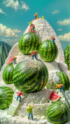 <lora:鼻涕泡_微缩王国_V1.0:0.9>,highly detailed,ultra-high resolutions,32K UHD,best quality,masterpiece,tao,chi,multiple boys,watermelon,food,fruit,outdoors,cloud,The image showcases a whimsical scene where miniature figures are depicted as if they are climbing or working on a large,spherical watermelon,set against a backdrop of a blue sky with fluffy white clouds.,