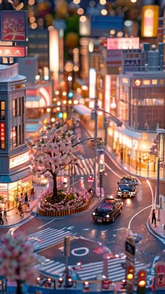 <lora:鼻涕泡_微缩王国_V1.0:0.9>,highly detailed,ultra-high resolutions,32K UHD,best quality,masterpiece,tao,chi,motor vehicle,car,road,street,outdoors,blurry,lamppost,scenery,crosswalk,tree,traffic cone,cherry blossoms,road sign,city,building,sign,The image showcases a miniature cityscape with intricate details,vibrant lights,and a dreamy atmosphere.,