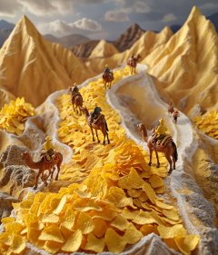 <lora:鼻涕泡_微缩王国_V1.0:0.9>,highly detailed,ultra-high resolutions,32K UHD,best quality,masterpiece,tao,chi,outdoors,scenery,horse,sky,cloud,multiple boys,Four miniature figures on horseback traverse a path made of golden-yellow snack chips,set against a backdrop of rugged mountains and a cloudy sky.,