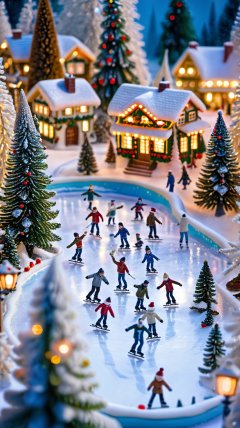 <lora:鼻涕泡_微缩王国_V1.0:0.9>,highly detailed,ultra-high resolutions,32K UHD,best quality,masterpiece,tao,chi,christmas tree,snow,christmas,outdoors,blurry,multiple boys,hat,tree,The image showcases a miniature winter wonderland with people ice-skating on a frozen pond surrounded by snow-covered trees and houses,all illuminated by warm lights.,