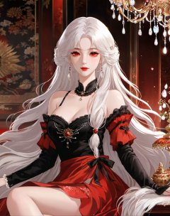 highly detailed,ultra-high resolutions,32K UHD,best quality,masterpiece,exquisite style,1girl,folding fan,red nails,sitting,A serene-looking female character with long white hair,red eyes,and a black dress sits in a luxurious room adorned with chandeliers and decorative items.,<lora:Exquisite style-000007:0.85>,