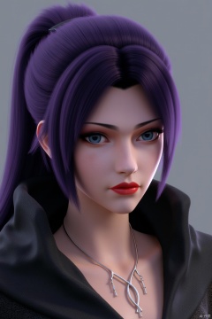 masterpiece,ultra detailed,textured skin,super detail,best quality, 1girl, solo, long hair, purple hair, black hair, ponytail, blue eyes, lips, red lips, lipstick, nose, makeup,necklace, jewelry, robe, simple background, grey background, flat color background, cowboy shot, upper body, looking at viewer,