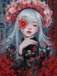 A young Asian woman wearing a flower wreath,An Acrylic style painting that is expressive, gives it a dynamic and emotional quality.a woman with a ethereal red and blue mist surrounding her body. The mist creates a dramatic and surreal effect. A red flower, that is blooming, covering one eye, attached to the face. The woman has a cold aesthetic, complimented by her white hair. Anime art of woman draped in shadows with a lighting that enhances her sexy unique features. with a black kimono adorned with flowers. The background is blurred The background is a wall with Chinese characters written on it creating a stark contrast to the woman's outfit. filled with red rose petals.
