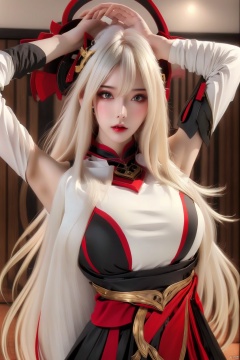 1girl, solo, long hair, breasts, looking at viewer, blush, bangs, skirt, large breasts, shirt, hair ornament, hair between eyes, bare shoulders, very long hair, white hair, multicolored hair, parted lips, detached sleeves, sleeveless, artist name, indoors, signature, armpits, arm up, lips, sleeveless shirt, red lips, hand on own head