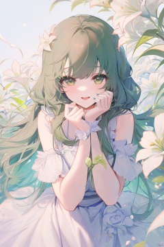 (best quality),(masterpiece),1girl, flower,white dress, solo, green hair, long hair, smile, open mouth, looking at viewer, bangs, white flower, green eyes,