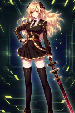 1girl solo long hair looking at viewer smile skirt blonde hair thighhighs long sleeves dress ribbon holding green eyes standing full body hair ribbon weapon necktie sword black thighhighs holding weapon hand on hip holding sword