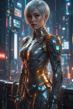 Anime style, a beautiful Japanese woman, 20 years old, with short silver hair and piercing green eyes, dressed in an advanced mecha suit with metallic armor and neon accents. She is standing on a skyscraper rooftop in a futuristic city at night, with neon lights, flying cars, and towering buildings in the background. The city is alive with glowing billboards and holograms.