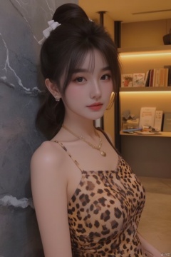 A woman with dark brown hair, pulled back in a ponytail with a white bow in the top right corner of her head, wears a leopard print sleeveless dress adorned with a gold chain around her neck and a gold earring in her left ear. She stands against a gray marble wall, its textured surface adding depth to the scene. The warm yellow walls and bookshelf filled with books create a cozy atmosphere.Trendy K Style, neon lighting, highly detailed, ultra-high resolutions, 32K UHD, best quality, masterpiece