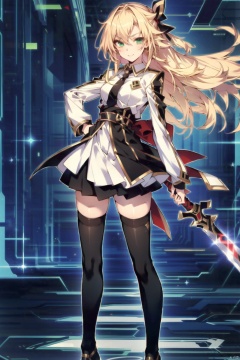 1girl, solo, long hair, looking at viewer, smile, skirt, blonde hair, thighhighs, long sleeves, dress, ribbon, holding, green eyes, standing, full body, hair ribbon, weapon, necktie, sword, black thighhighs, holding weapon, zettai ryouiki, hand on hip, holding sword