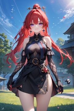 1girl, solo, long hair, breasts, looking at viewer, smile, bangs, hair ornament, gloves, dress, jewelry, very long hair, closed mouth, standing, purple eyes,  ponytail, red hair, earrings, black gloves, elbow gloves,  black dress, chain, mechanical arms, yinlin,outdoors, sunlight, lawn, blue sky,