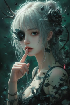 watercolor style,An Acrylic style painting that is expressive, gives it a dynamic and emotional quality. Anime art of a stylized portrait of a woman with a ethereal black and green mist surrounding her body. The mist creates a dramatic and surreal effect. A black flower, that is blooming, covering one eye, attached to the face. The woman has a cold aesthetic, complimented by her white hair. Anime art of woman draped in shadows with a lighting that enhances her unique features. The background is dark green, filled with black rose petals. Holding finger to lips, shush, shushing motion,.,Winslow Homer style