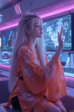 1girl ,Juxtaposition composition , asian, Cosplay, futuristic setting, vibrant colors, a woman with long white hair, wearing a traditional orange kimono with floral patterns, seated in front of a curved monitor displaying a sci-fi interface, right hand extended towards the screen, neon purple lighting, high-tech equipment in the background, dynamic and immersive atmosphere. mist,fog,, Volumetric lighting with subsurface scattering, light softly penetrates mist or fog, while beams of light pass through materials, creating a warm, glowing atmosphere.