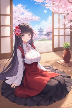 a cartoonish girl is seated on a wooden floor, adorned with a red and white dress and a long black skirt. She is adorned with flowers in her hair, adding a pop of color to the scene. The girl's long, dark hair cascades over her shoulders, framing her face. The scene is set against a backdrop of cherry blossom trees, a full moon, and a pagoda building. The sun is shining through the windows, creating a peaceful and serene atmosphere. To the right of the girl, a brown vase with a green leaf is placed on a pedestal.
