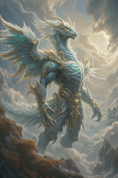 A majestic, full-body shot of a BOSSGUI-themed divine beast, its form a blend of mythical elements and regal features. The creature stands proudly, with wings spread and head held high, exuding an aura of power and grace. The background is a celestial landscape, with floating islands and a sky filled with swirling, iridescent clouds. The composition is centered on the beast, with a dynamic pose that captures its divine presence and the intricate details of its scales and feathers. The lighting is ethereal, with a soft, golden glow that highlights the beast's majestic form and the mystical atmosphere of the scene, creating a sense of awe and reverence.