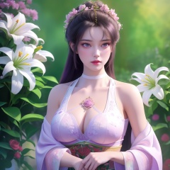 <lora:763-DA-仙逆-墨云:0.8>, (,1girl, ,best quality, ),looking at viewer,  ,ultra detailed 8k cg,ultra detailed background,ultra realistic 8k cg,1girl, solo,(bare shoulders:0.85),(masterpiece, best quality),((oil painting style)),sexy young lady,(beautiful face and eyes),(upper body:1.5),(whole body:1.05),(single person:1.2),surrounded by flowers, (lily), roses, floret, vegetation, white, purple, purplish pink,Impressionism,colorful,(Breast size:1.3),(cleavage),,