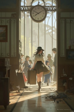 hat, clock, walking, indoors, suitcase, bird, scenery, 6+boys, boots, holding, multiple girls, multiple boys, pants