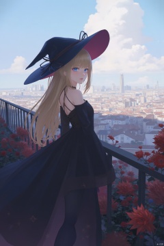 1girl, solo, long hair, hat, blue eyes, dress, witch hat, blonde hair, scenery, outdoors, looking at viewer, cityscape, railing, black dress, flower, looking back, sky, cloud, thighhighs, witch, bangs, bare shoulders, red flower, city, black headwear
