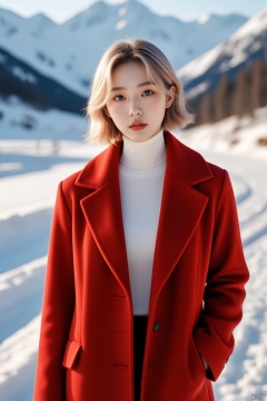 Outdoor scenery, snow view, Snow Mountain, girl, red wool coat, pretty face, short hair, blonde hair, (photo reality: 1.3) , Edge lighting, (high detail skin: 1.2) , 8K Ultra HD, high quality, high resolution, the best ratio of four fingers and a thumb, (photo reality: 1.3) , wearing a red coat, white shirt inside, big chest, solid color background, solid red background, advanced feeling, texture full, 1 girl, Xiqing, HSZT, Xiaxue, dongy, a girl, magic eyes, black 8d smooth stockings, 1girl, sd_mai, xiqing, tm, ((poakl flower style)), ((poakl))