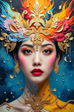 Create an abstract art, front portrait of a woman in an expressive oil painting style. Use a vivid explosion of colors including blue, yellow, red, white, pink, black, and green. The portrait should be symmetrical and hyper-detailed, with a gleaming golden accent to radiate light. Incorporate elements like pearls and filigree to add texture. The composition should be ethereal, blending sky, flowers, water, and fire to create a harmonious and brilliant visual experience,1girl,abstract oil