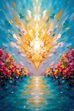 abstract art, expressive, oil painting, landscape, blue, yellow, red, white, pink, cyan, green, gleaming diamond with golden accents, radiating light, amidst brilliance, symetrical hyperdetailed texture, pearl filigree, perfect composition, ethereal, sky, flower, water,abstract oil