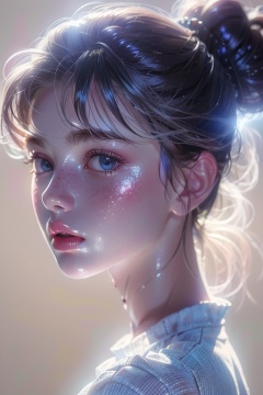 1girl,solo,blue eyes,long hair,looking at viewer,lips,eyelashes,portrait,bangs,black hair,sparkle,closed mouth,collarbone,shirt,backlighting,