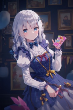 Anime style,The image is an illustration of a young girl with long white hair and blue eyes. She is wearing a blue and purple plaid dress with a gold bow on the waist. The dress has a high neckline and long sleeves. The girl is holding a small pink box with multiple compartments, which appears to be a makeup palette. The background is a dark room with a chandelier hanging from the ceiling and several framed pictures hanging on the wall. The overall mood of the image is romantic and whimsical.
