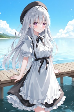 The image is an illustration of a young girl with long white hair and a black hat. She is standing on a wooden pier with a beautiful view of the ocean in the background. The girl is wearing a white dress with a black ribbon tied around her waist and a white apron. She has a sad expression on her face and is looking off into the distance. The sky is blue with white clouds and the ocean is a deep blue-green color. The overall mood of the image is peaceful and serene.