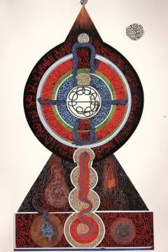 a painting of a tree with a snake on it , solo, english text, no humans, text focus, abstract , a drawing of a pyramid with a clock on top