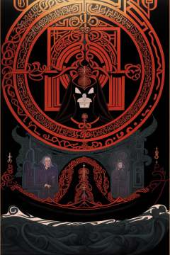 a painting of a woman in a dark room holding a clock in her hands and a red hood on her head and a black robe on her head , Alasdair Gray, comic cover art, a gouache, metaphysical painting , a painting of a boat with a man in it , english text, no humans, watercraft, waves, boat