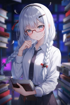 (masterpiece), (best quality), illustration, ultra detailed, hdr, Depth of field, (colorful),loli,1girl, solo, long hair, looking at viewer, bangs, shirt, white hair, holding, closed mouth, upper body, braid, glasses, collared shirt, white eyes, twin braids, book, holding book, red-framed eyewear, book stack
