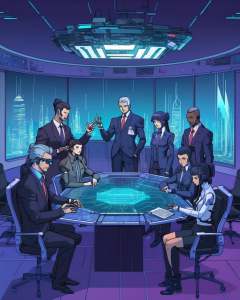 anime, Megacorporate boardroom, executives seated around a holographic table, manipulating data with futuristic hand gestures.,  cyberpunk, cyberpunk art, retrofuturism<lora:Cyberpunk _Anime_sdxl:1.0>
