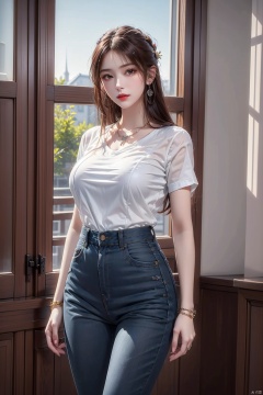 8K image. ((poakl)),叶倾仙,1girl, solo, long hair, breasts, looking at viewer, large breasts, shirt, black hair, jewelry, standing, white shirt, short sleeves, cowboy shot, earrings, parted lips, day, collared shirt, pants, indoors, necklace, bracelet, lips, window, plant, denim, jeans, hoop earrings, blue pants, red lips, shirt tucked in, high-waist pants