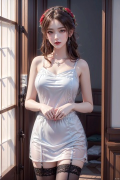 8K image. ((poakl)),叶倾仙,1girl, solo, long hair, breasts, looking at viewer, black hair, thighhighs, dress, holding, bare shoulders, jewelry, medium breasts, closed mouth, standing, collarbone, flower, cowboy shot, earrings, sleeveless, black thighhighs, indoors, necklace, black dress, lips, makeup, sleeveless dress, rose, garter straps, lipstick, red flower, red nails, side slit, red rose, red lips, lamp, blinds