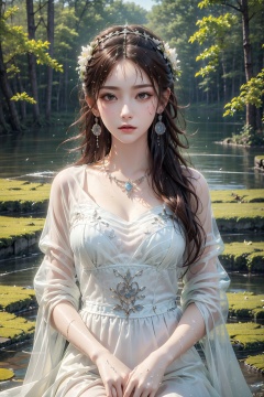 8K image. ((poakl)),叶倾仙,1girl, solo, long hair, black hair, hair ornament, dress, jewelry, sitting, upper body, earrings, water, white dress, wet, petals, facial mark, forehead mark