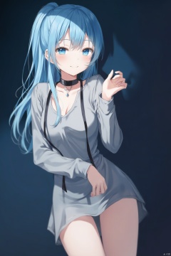 An animated image of an anime girl with long blue hair and blue eyes. She is wearing a gray dress with a black necklace around her neck. Her hair is pulled back in a ponytail. Her eyes are a piercing blue color. Her eyebrows are a light brown color. She has a slight smile on her face. Her left hand is raised in front of her body. Her right hand is resting on her hip. The background is a dark blue. Her shadow is on the right side of the image.