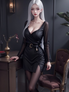 1girl,breasts,solo,long hair,dress,white hair,cleavage,pantyhose,red lips,looking at viewer,indoors,standing,black dress,long sleeves,closed mouth,makeup,nail polish,jewelry,grey eyes,earrings,black pantyhose,high heels,red nails,lips,medium breasts,clothing cutout,black footwear,belt,lipstick,boots,full body,large breasts,table,cleavage cutout,