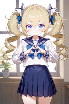 masterpiece,best quality,1girl, barbara_\(genshin_impact\), solo, skirt, school_uniform, heart, heart_hands, blue_eyes, blonde_hair, sailor_collar, pleated_skirt, twintails, blue_skirt, long_sleeves, serafuku, bow, white_shirt, twin_drills, blue_sailor_collar, drill_hair, shirt, looking_at_viewer, window, alternate_costume, blue_bow, closed_mouth, long_hair, indoors, bowtie, blush, plant, hair_between_eyes, cowboy_shot, blue_bowtie, standing, potted_plant