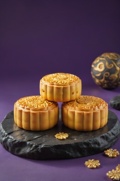 Product photography, mooncakes, purple background, high-end feel, gold mooncakes, mooncakes made of gold ,black rock,Mooncakes placed on rocks,zq-hd