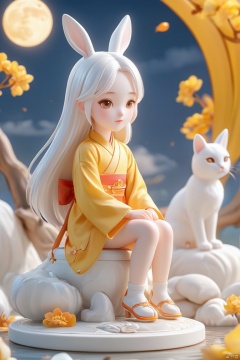 A serene and whimsical scene unfolds as a porcelain figurine of an Asian girl, donning a bright yellow kimono adorned with a vibrant red bow, sits elegantly on a white porcelain potty. Her piercing blue eyes sparkle beneath two delicate white bunny ears, while her long white hair is styled in a ponytail, adding a pop of color to the composition. The background softly blurs, featuring a backdrop of sunny yellow flowers and a glowing full moon. To the right, a white cat sits regally on a pile of rocks, adding a touch of tranquility to the enchanting scene.