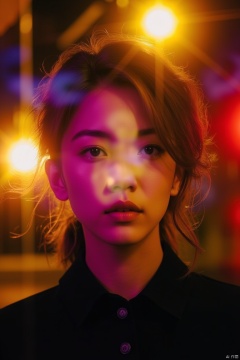 best quality,masterpiece,ultra high res, a close-up of a woman's face can be seen. The woman's hair is a vibrant shade of brown, and her eyes are a piercing blue. She is wearing a black shirt with three buttons on the front. Her hair is pulled back in a ponytail, adding a touch of color to her face. The background is a mix of yellow, orange, and black, creating a vibrant contrast to the woman's head. Above her head, there are three bright lights that are illuminated, adding depth to the scene.over exposure,purple and red tone impression,abstract,whole body capture,