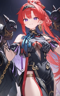 (score_9,score_8_up,score_7_up),(ningen mame), 1girl,(masterpiece:1.3),( beautiful:1.2),(high quality:1.2),(finely detailed:1.2),extremely detailed CG unity 8k wallpaper,best quality,a very delicate and beautiful,perfect fingers,(one cute girl at the center:1.2), 1girl, solo, long hair, breasts, looking at viewer, smile, bangs, hair ornament, gloves, dress, bare shoulders, jewelry, medium breasts, very long hair, closed mouth, standing, purple eyes, ponytail, red hair, earrings, black gloves, elbow gloves, black dress, chain, mechanical arms,yinlin