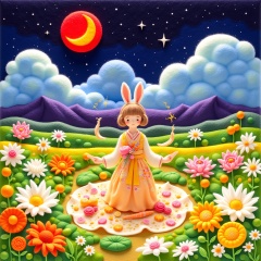 Texture of yarn,1girl,bunny,camellia,carrot,cherry blossoms,cloud,crescent moon,daisy,dandelion,earth \(planet\),egasumi,field,flower,flower field,food,full moon,hair flower,hibiscus,holding flower,honey,lily \(flower\),lily pad,lotus,mandarin orange,moon,moonlight,mountain,night,night sky,orange \(fruit\),orange flower,pancake,paper lantern,petals,pink flower,planet,plate,red flower,red moon,round window,sky,solo,star \(sky\),sun,sunflower,tulip,vase,white flower,yellow flower,yellow rose,