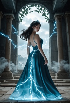 In a mystical, enchanting scene set within an ancient, overgrown temple deep in a forest, a beautiful Southeast Asian woman stands at the entrance, looking back with an alluring gaze, inviting you into the temple. The focus is on her nicely curved, firm behind, highlighted by her minimal clothing that glows softly in the torchlight. Her dress appears to be made of living elements—lightning, clouds, and fog—clinging to her curves and creating an ethereal, magical atmosphere. Tendrils of electricity crackle along the dress’s surface, casting a blue-white glow on her brown skin, while wispy clouds swirl around her torso, forming a shifting bodice. Delicate fog trails down, forming a flowing skirt that fades into the air, revealing glimpses of her thighs.The ancient ruins around her are adorned with intricate carvings and vines, giving the place a sacred and otherworldly feel. Flickering torches cast dancing shadows on the stone walls, adding to the surreal ambiance. Her hair is swept up in a windswept style, strands lifting as if charged with static electricity. The temple’s interior, though blurred in the background, hints at a warm, muted atmosphere, contrasting with the electric blue glow of her dress. Dynamic lighting plays a crucial role, with rhythmic pulses of bright flashes illuminating the scene and casting dramatic shadows that accentuate her curves, creating an almost dreamlike calmness that draws you deeper into this mystical, ancient place., score_9,beast_quality,masterpiece,8k,dramatic lighting,cold colors,