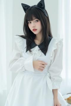a young woman posing in a white dress with a black collar and a white apron. she is standing in front of a white wall with white curtains in the background. the woman has long dark hair styled in a cat ears headband with black cat ears on top. she has a serious expression on her face and is looking directly at the camera. the dress is made of a light-colored fabric with a ruffled skirt and a black garter belt around, solo, long hair, animal ears, black hair, maid, realistic, cat ears, dress, brown eyes