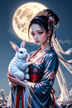 cka01,1girl,rabbit,moon,jewelry,holding animal,hanfu,earrings,hair ornament,night,full moon,chinese clothes,black hair,long sleeves,upper body,solo,makeup,night sky,blurry,flower,sky,blue dress,wide sleeves,blurry background,floral print,hair flower,looking down,<lora:cy01:0.8>,, best quality, ultra-detailed, masterpiece, finely detail, highres, 8k wallpaper