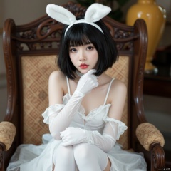 a young woman seated on an ornate chair. She is wearing white thighhighs with lace detailing, white gloves, and white panties. She has on white bunny ears, which are realistic in appearance. Her black hair is styled in a bob, and she is looking directly at the viewer. The background is blurry, but it seems to be an indoor setting with a hint of a yellow object, possibly a vase or decorative item.
