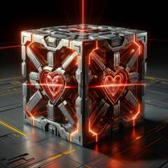 <lora:LaserTech:0.9> , scifi , lasertech , military grade, laser beams ,   heart shape , weighted companion cube,cube